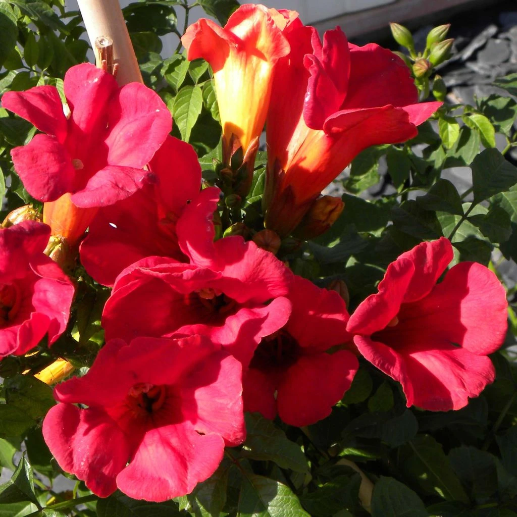 Le Campsis Summer Jazz® Fire® fait partie d’une série de Bignones hybrides sélectionnées pour leur développement très réduit, parfaitement adapté aux petits espaces mais aussi à la culture en pots pour l’ornement des terrasses et des balcons ensoleillés. Peut-être plus encore que ses grandes soeurs, cette petite grimpante particulièrement facile à conduire en arbuste livre une abondante et longue floraison estivale au charme exotique, sous forme de grappes alourdies de grandes trompettes éclatantes d’un rouge vif, teintées d’orange à la gorge. Une bien jolie façon d’apporter au moindre décor un petit air de vacances !