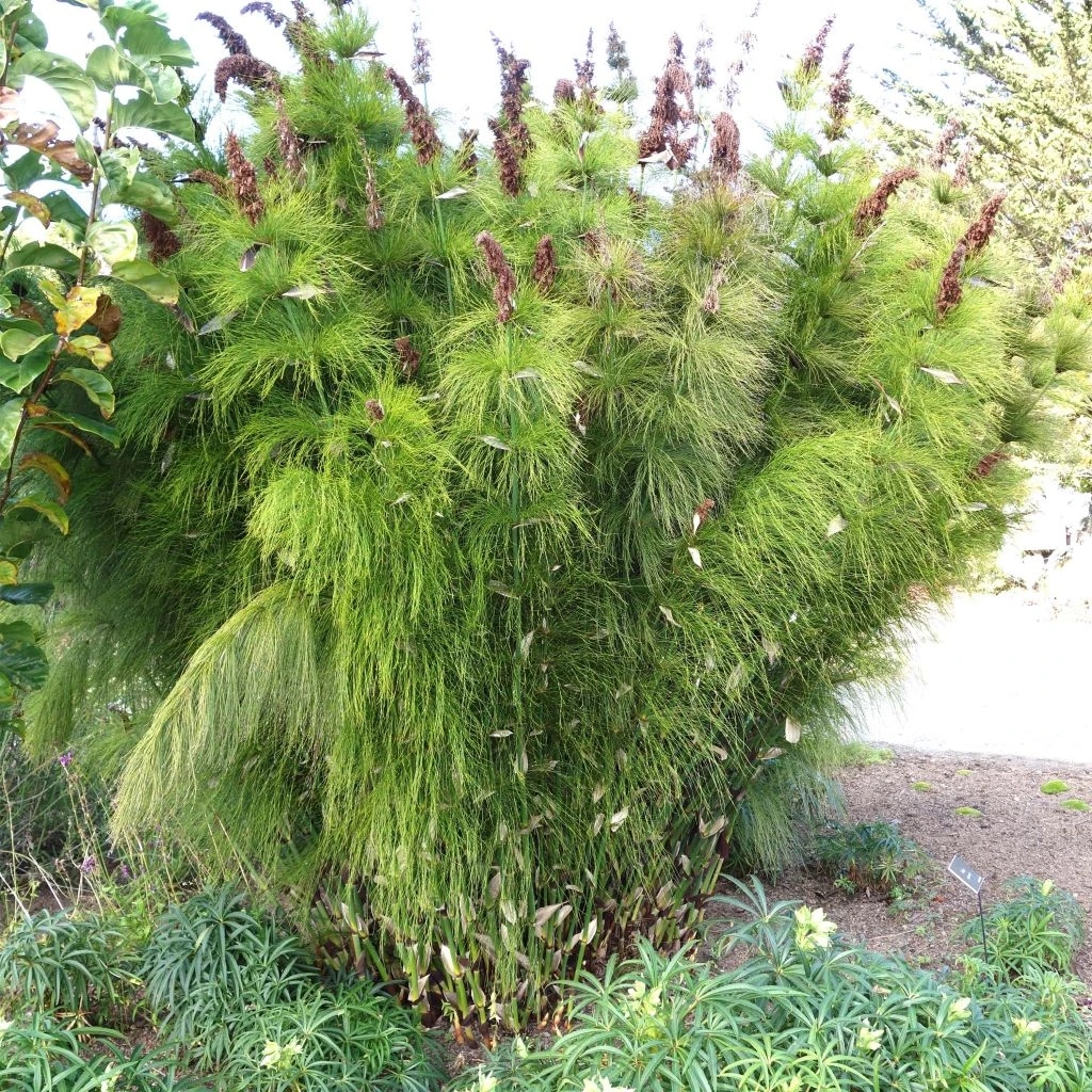La Prêle restio est une ‘herbe’ vivace à rhizome rampant de croissance plutôt lente. Son port est buissonnant, légèrement étalé. Elle atteindra 1m50 de hauteur pour 90cm de diamètre à la base (1 m à 1,20 m pour la couronne) en pleine terre sous nos climats. En pots, elle culminera à 1m20 et s’étalera sur 50cm à la base, la couronne atteignant 80cm de diamètre. Lorsque les conditions sont optimales, cette plante s’étendra latéralement jusqu’à former de larges touffes de plus d’1m de diamètre. Elle développe de jolies tiges pubescentes et cannelées. Le long de ses tiges, à intervalles réguliers, au niveau des noeuds, sont implantés des sortes de bouquets de rameaux, plumeux, rassemblés en verticilles denses. Une grande bractée papyracée enveloppe chaque verticille, conférant alors à la plante une réelle valeur décorative à ce stade. Ces grandes bractées produisent un bruissement doux et intriguant lorsqu’elles sèchent. Les tiges sont dépourvues de vraies feuilles mais portent des petites bractées bronze. La floraison a lieu en mai-juin, sous forme de petites bractées brunes à l’extrémité des rameaux, suivies par la formation de fruits évoquant des petites noix ailées.